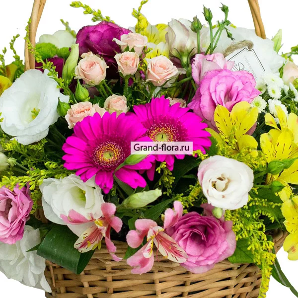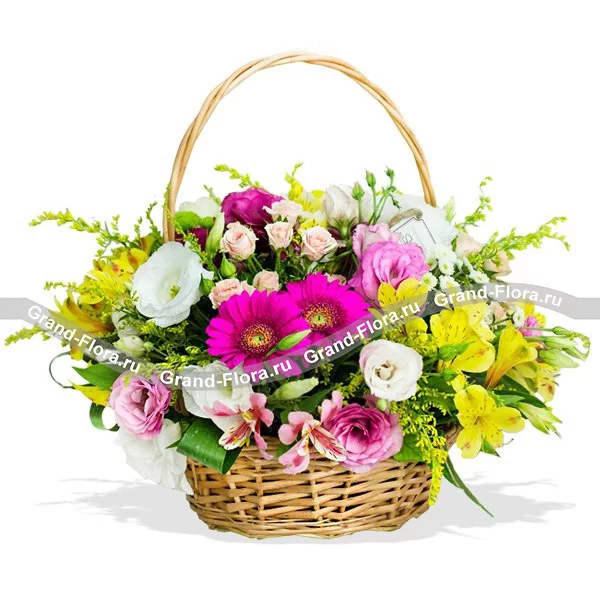 Данная корзина создает впечатление  будто вы летним, солнечным утром, прогуливаясь по полям, собрали  букет свежих цветов, что бы покорить этот мир и удивить человека, которому предназначенно это цветочное чудо.Яркая  и контрастная композиция в корзине,  выполненная  из свежих разнообразных цветов, сделает неожиданный подарок приятным и будет радовать глаз еще долгое время.