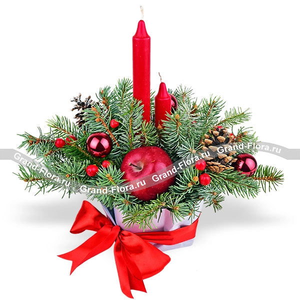 Стандартный: ель, гиперикум красный - 2 шт., шишка - 2 шт., новогодний декор, яблоко,  свеча - 2 шт.,оазис, упаковка.