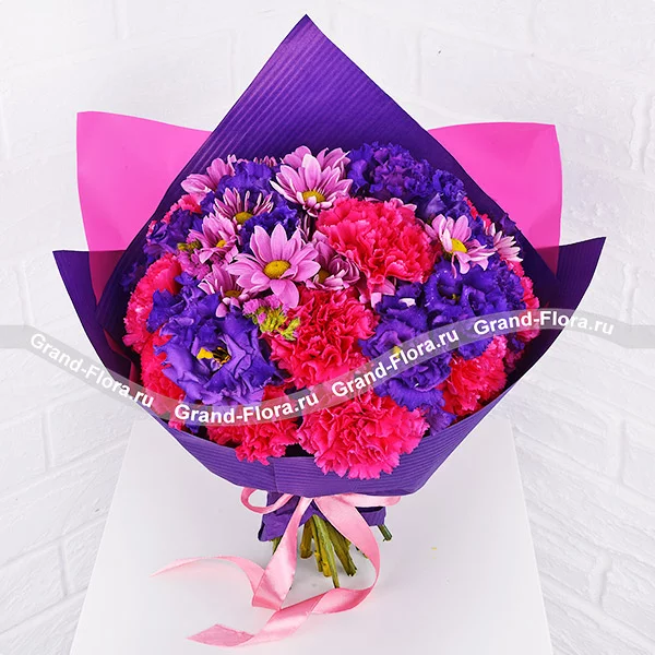 Люкс: гвоздика розовая - 10 шт., эустома синяя - 13 шт., хризантема кустовая фиолетовая - 6 шт., упаковка, лента. Примерный размер: 40Х40 см.